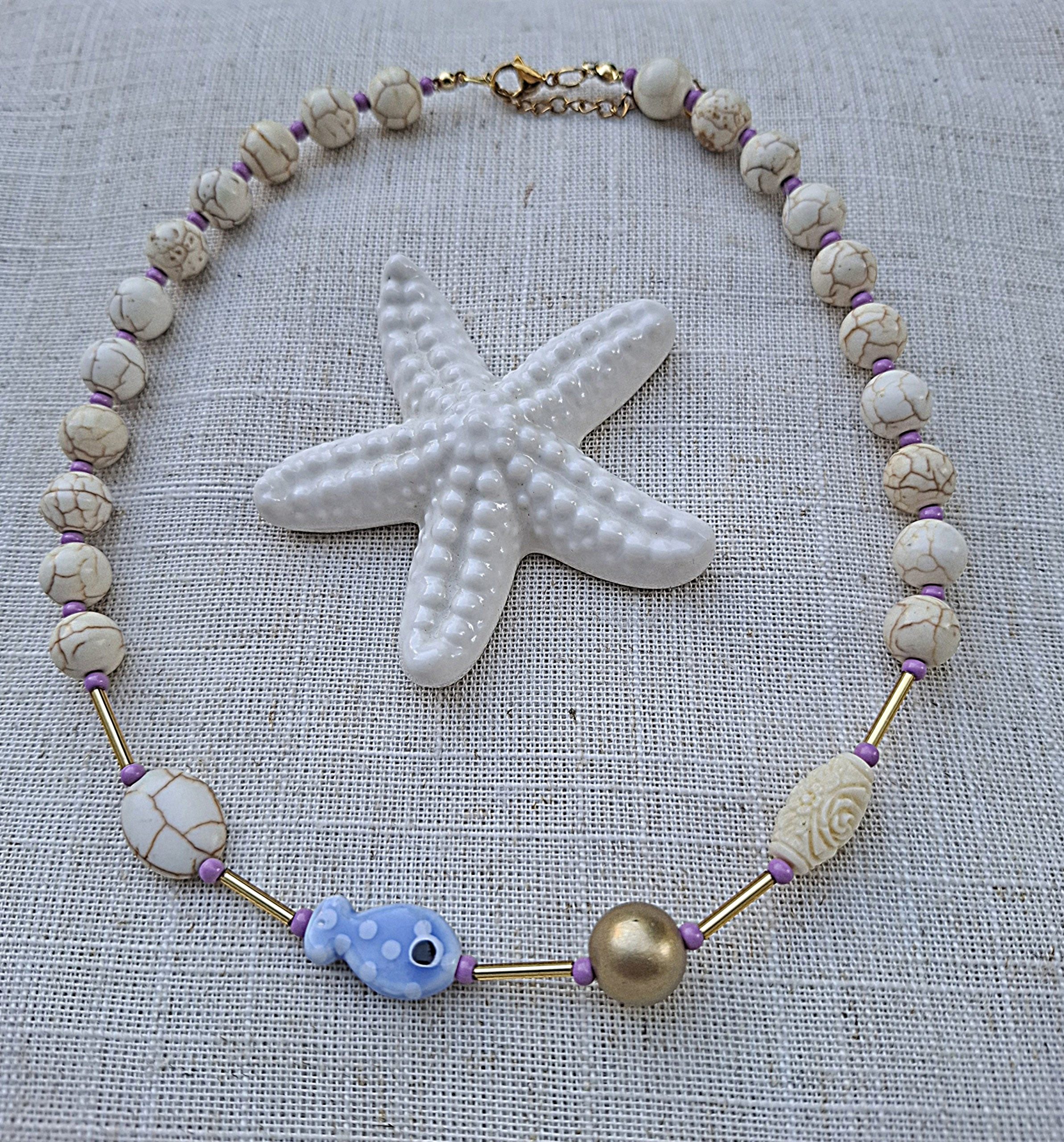 ogrlica od houlita, koralja i keramičke ribice, Dužina ogrlice 40 x  5 cm
