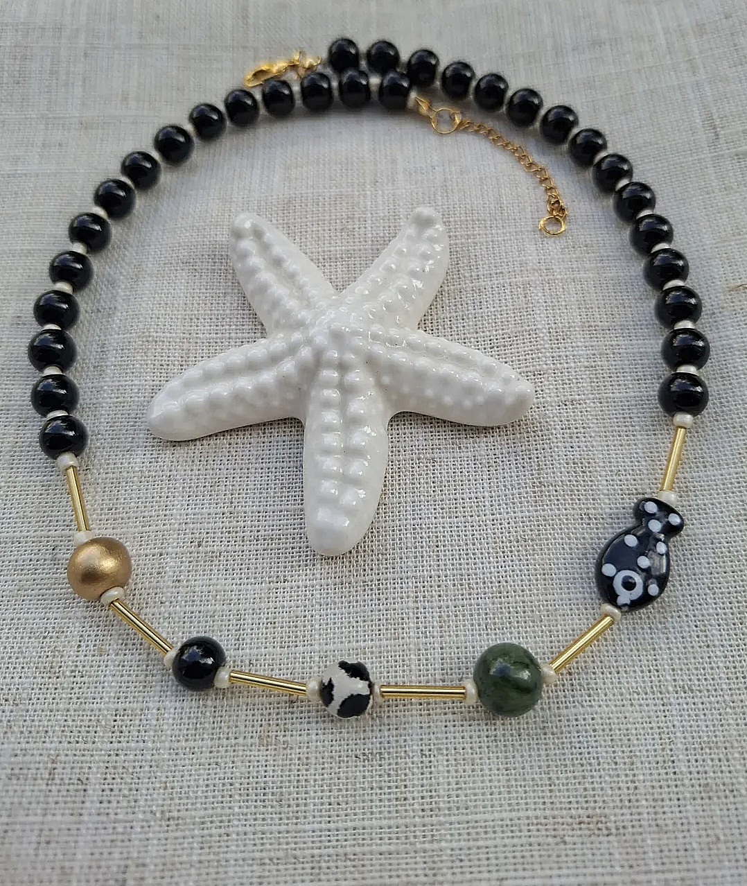 crna ogrlica od staklenih perli, keramičke ribice, ahata. Dužina 40 + 5 cm