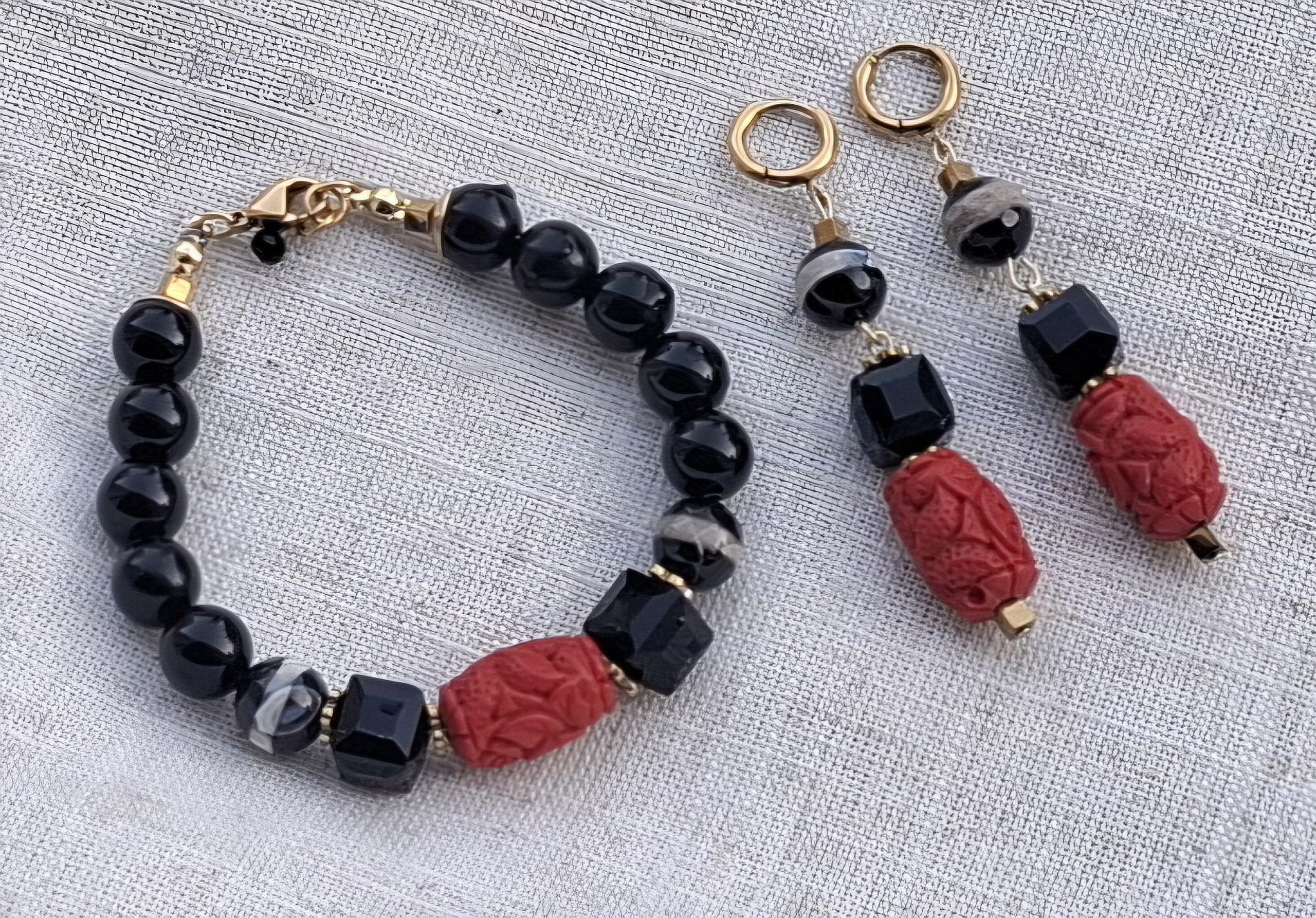 komplet od ahata i cinabarita, dužina narukvice 19 + 2 cm, dužina naušnica 7 cm