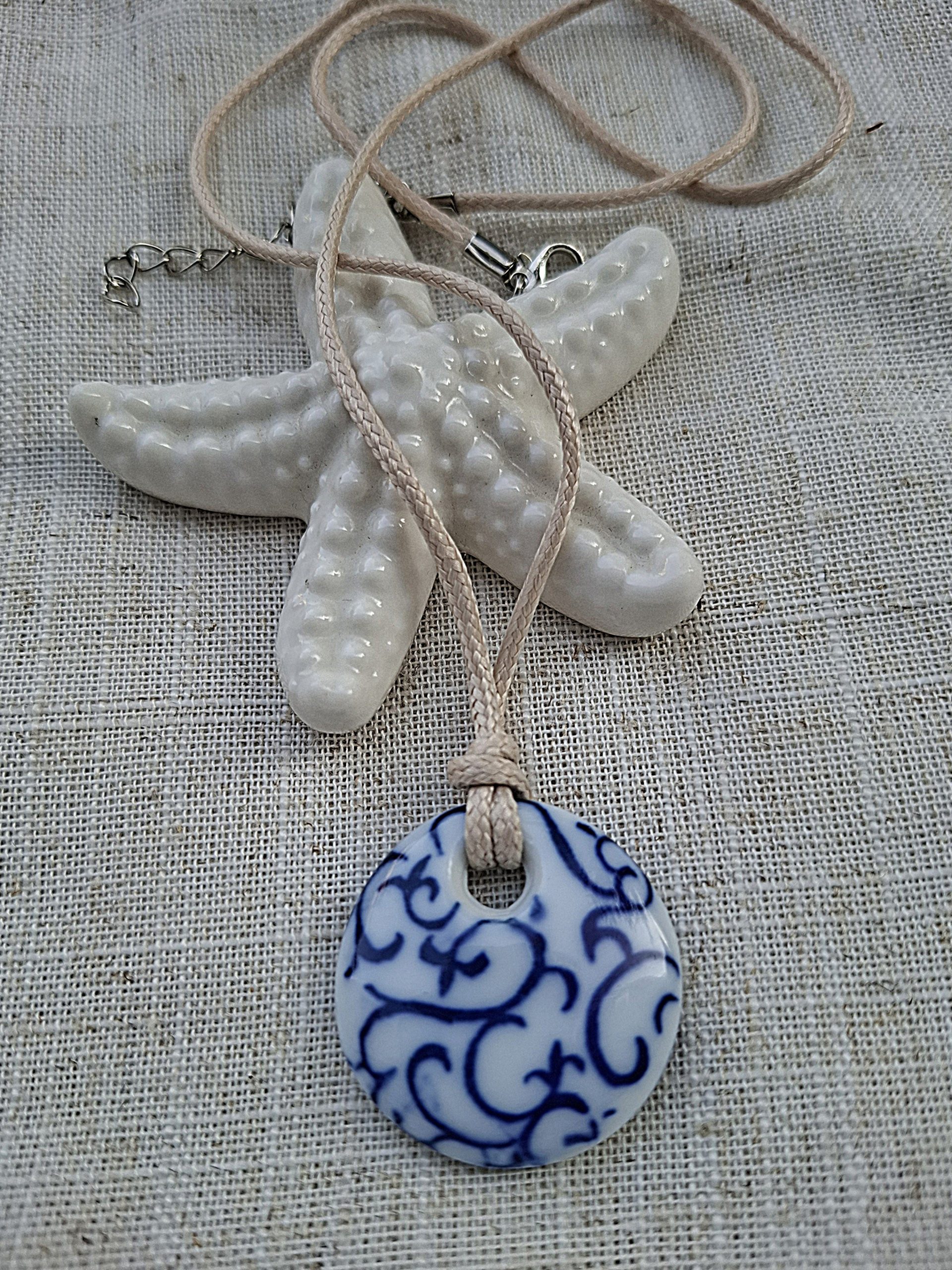 plavo bijela ogrlica od keramike, dužina 50 + 5 cm, privjesak 3 x 3 cm