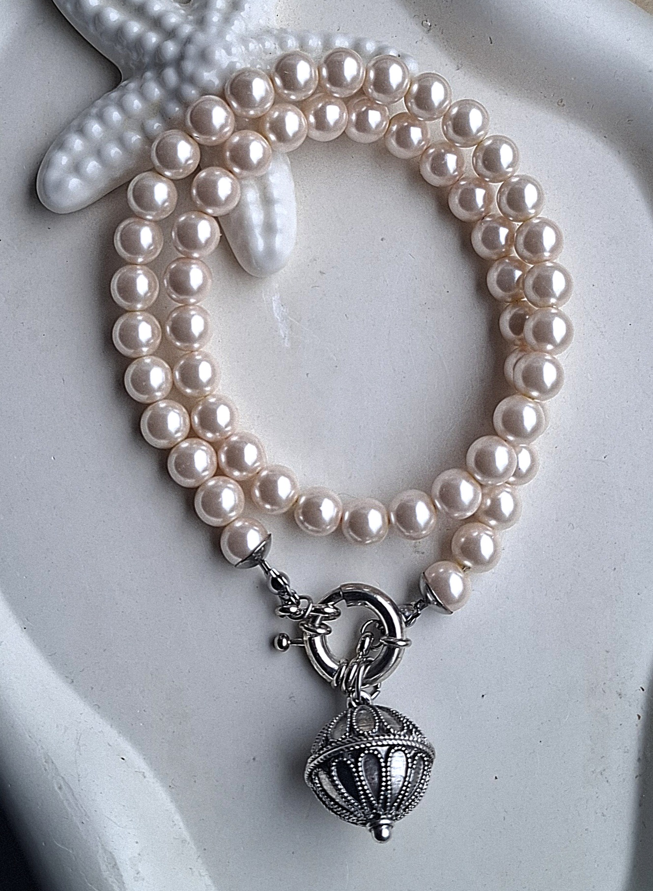 ogrlica od staklenih perli nježno ružičaste boje s botunom koji se može skinuti te se može nositi na dva načina, dužina s privjeskom 50 cm, privjesak 2,5 x 2,5 cm